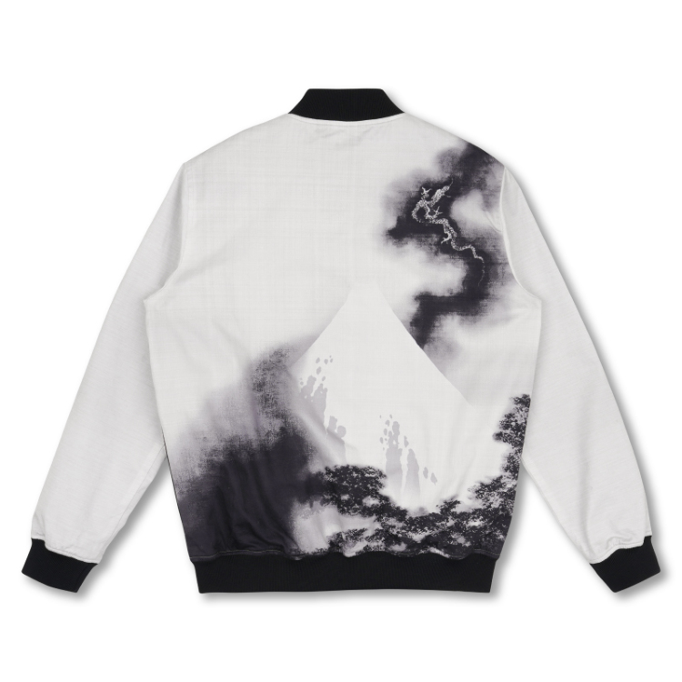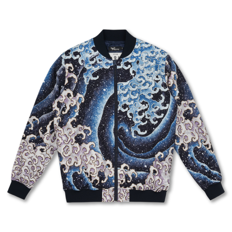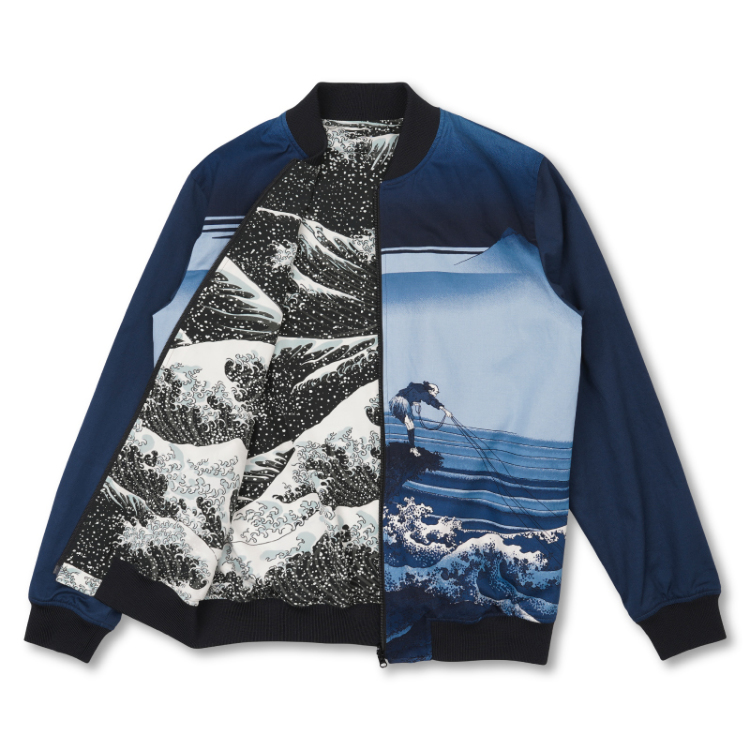 北斎の作品は、波や風の躍動感ある表現が特徴でブルゾンとの相性がよく、