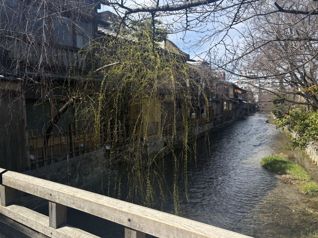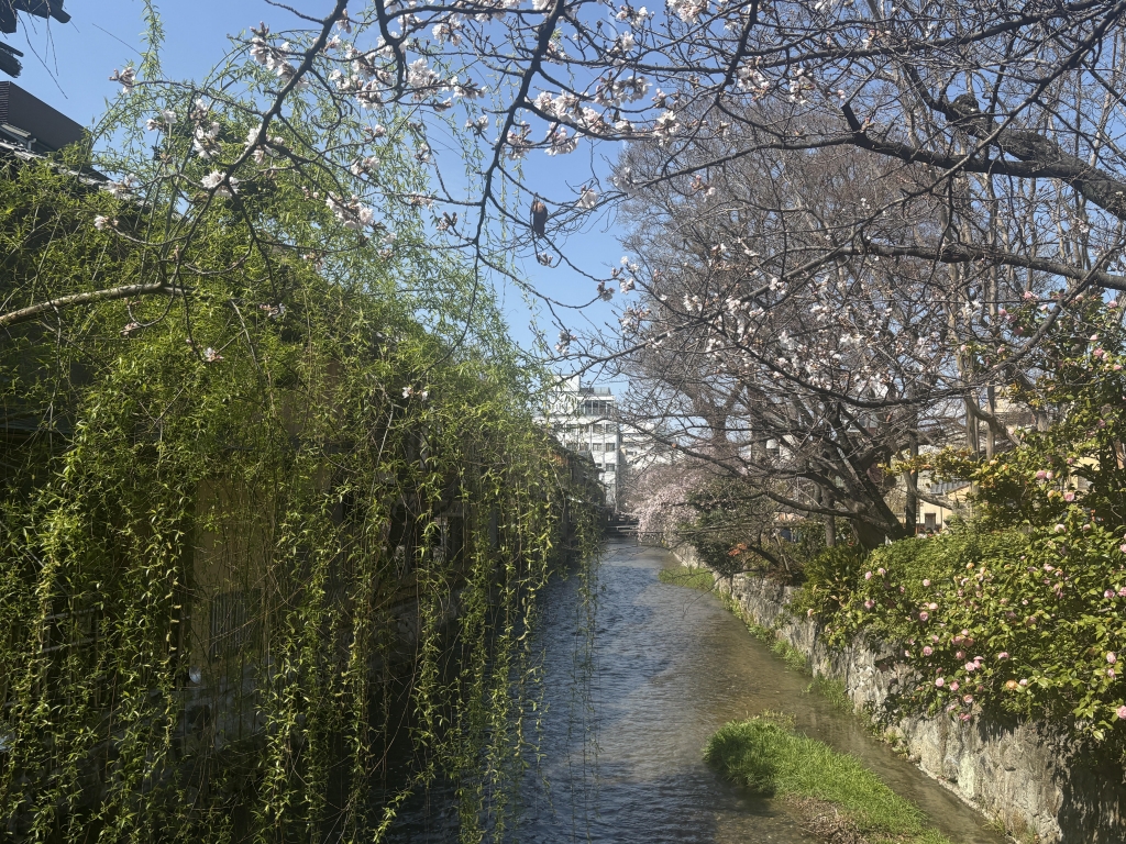 鴨川沿いでは、桜が少しずつ咲き始めていて、景色にやわらかな色が加わっていました。