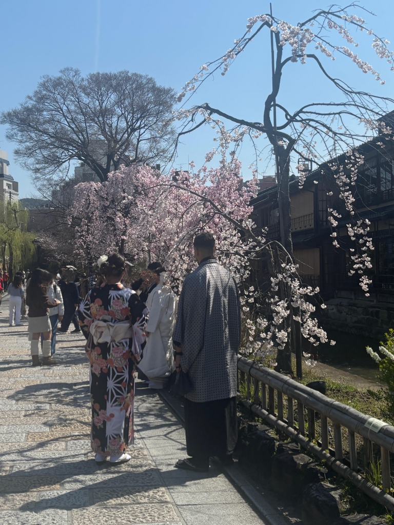 巽橋の周辺では、桜の下で写真を撮る人の姿が増え、着物姿の方も多く見かけるように。