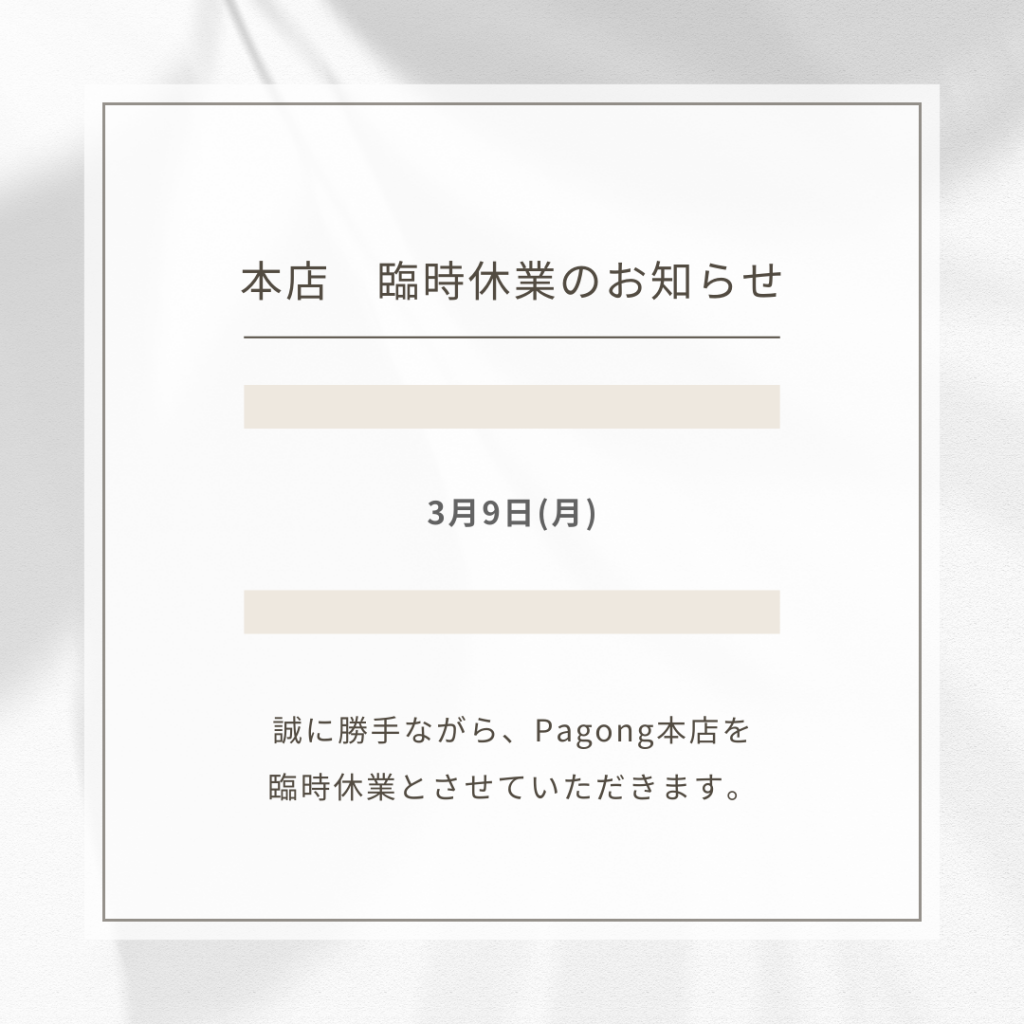 誠に勝手ながら建物の工事のため、3月9日(月)は Pagong本店 を臨時休業とさせていただきます。