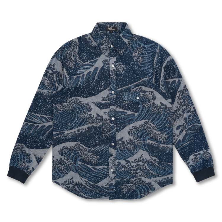 ▼葛飾北斎 ダンガリーオーバーサイズーシャツ <大波/紺>